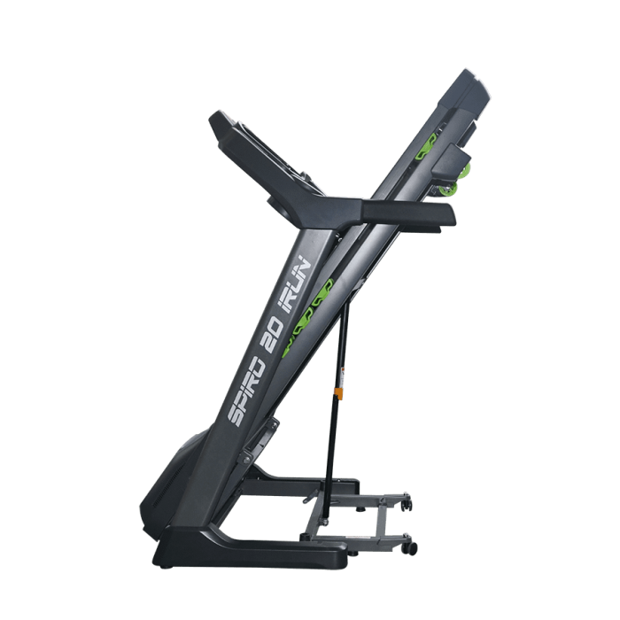 Тренажёр оснащён продуманной системой складывания, благодаря которой дорожка легко поднимается и фиксируется специальным замком. Гидравлический поршень обеспечивает плавность движения, а транспортировочные ролики делают перемещение тренажёра по квартире максимально простым.