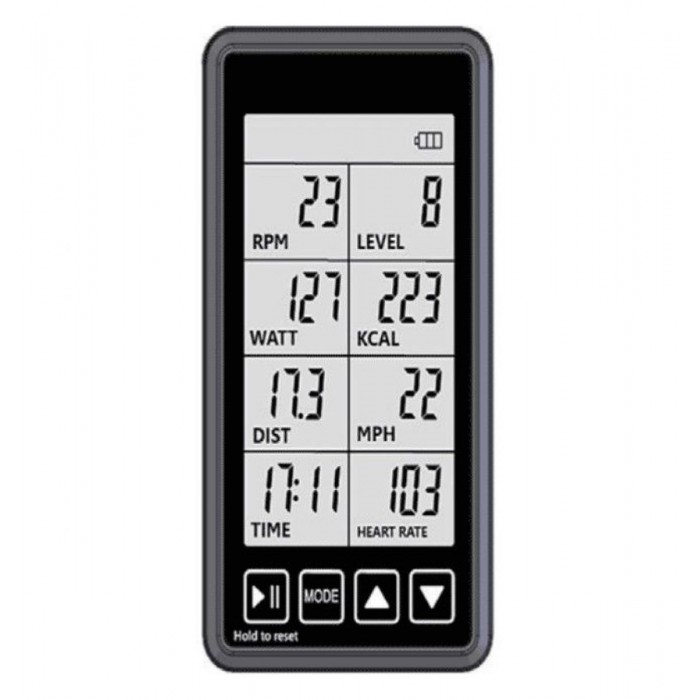 - Дисплей: 13 см, відображає час, швидкість, дистанцію, калорії та пульс