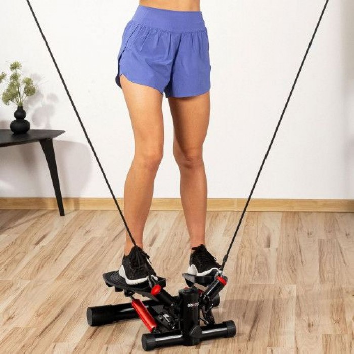 Головна особливість цієї моделі – поворотна система педалей, яка забезпечує рух у двох площинах – вгору/вниз та назовні/досередини. Це дозволяє опрацьовувати більше м’язових груп і формувати красиву талію та стегна. Неслизькі платформи гарантують безпеку, а регулювання висоти педалей дає можливість налаштовувати навантаження під індивідуальні потреби. Додатково в комплект входять еспандери, які допомагають задіяти верхню частину тіла та зробити тренування комплексними.